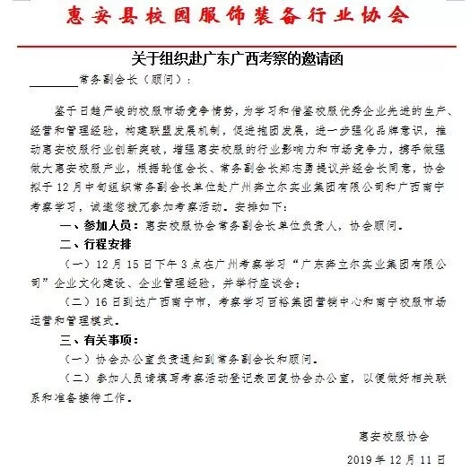 惠安縣校園服飾裝備行業(yè)協(xié)會(huì)赴廣東/廣西考察活動(dòng)