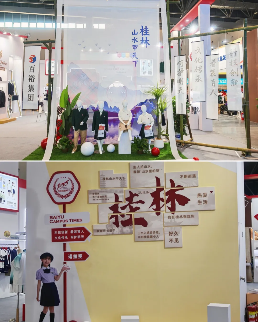 此次參展,百裕集團(tuán)巧妙融合桂林地域文化特色,將“水墨丹青”系列校服產(chǎn)品置于沉浸式的桂林山水場景之中:一幅徐徐展開的靈動(dòng)畫卷,將清新雅致的校服與詩意山水交相輝映,生動(dòng)詮釋了校園服飾美學(xué)與地域文化傳承的完美結(jié)合,彰顯了百裕在校服設(shè)計(jì)領(lǐng)域的深厚功底與美學(xué)追求,展位還精心設(shè)計(jì)打卡區(qū),吸引了眾多參觀者駐足欣賞、拍照留念。