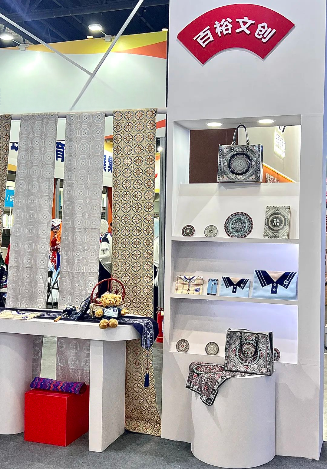 展示了與廣西經(jīng)貿(mào)職業(yè)技術(shù)學(xué)院共建的 “服裝數(shù)字化(百裕)產(chǎn)業(yè)學(xué)院” 階段性成果。展區(qū)涵蓋校服樣式文具筆袋、壯錦布及民族風(fēng)格的文創(chuàng)衍生品等。這些文創(chuàng)產(chǎn)品生動(dòng)詮釋了“教育+文化+產(chǎn)業(yè)” 的創(chuàng)新模式,成為展位中融合創(chuàng)新的亮眼板塊。