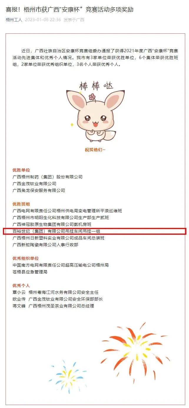 1月06日,廣西壯族自治區(qū)安康杯競賽組委辦通報了獲得2021年度廣西“安康杯”競賽活動先進(jìn)集體和優(yōu)秀個人情況。百裕世紀(jì)(集團)有限公司吊掛車間吊掛一組榮獲“優(yōu)勝班組”稱號。