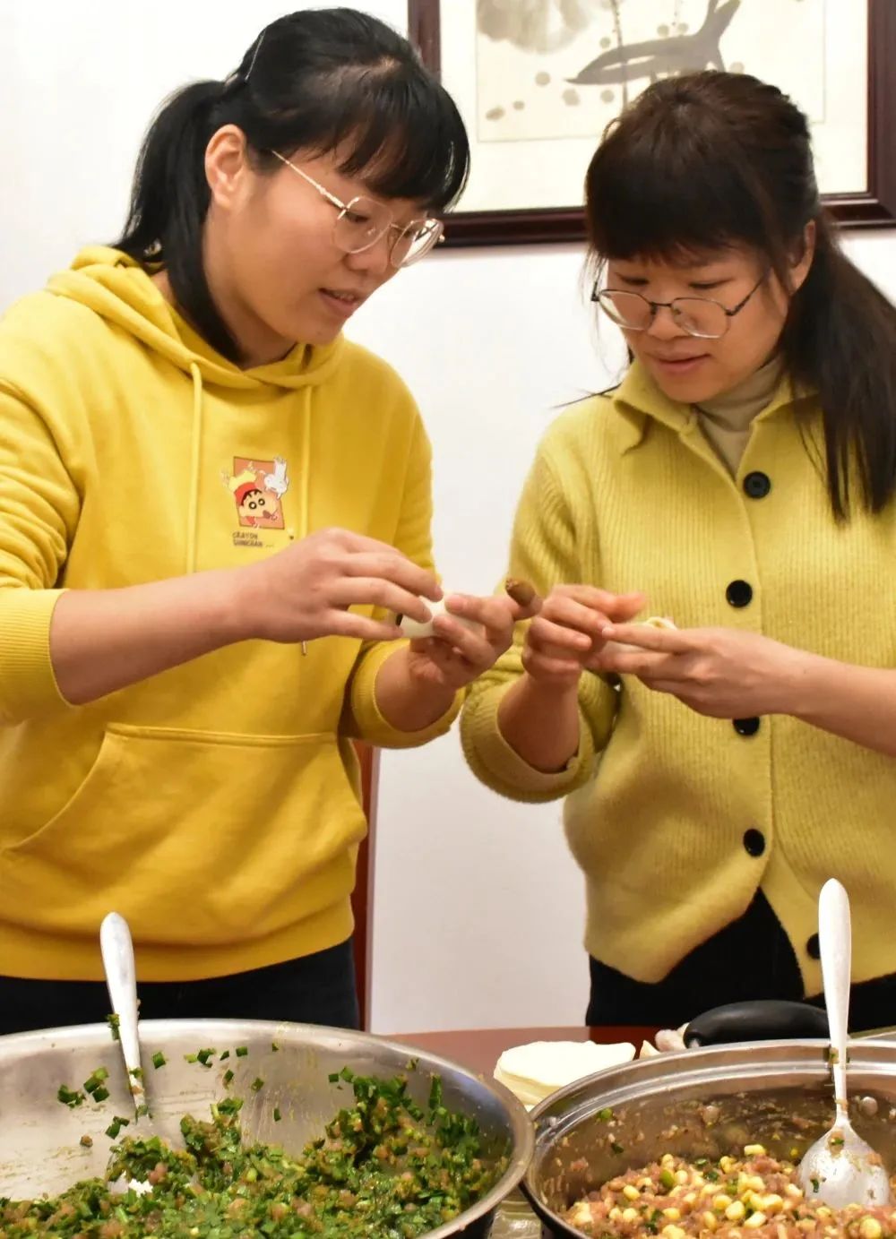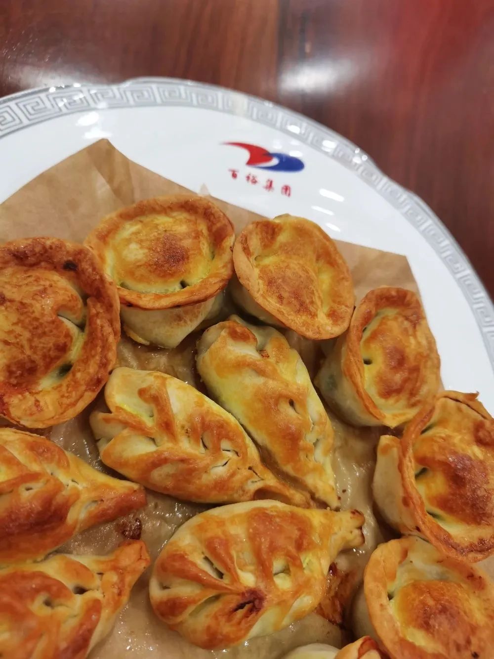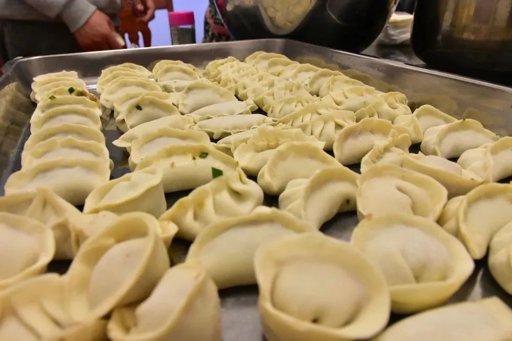 新春伊始,大家齊聚餐廳各顯神通,放餡、捏皮,完整連貫。一會兒功夫,一盤盤大小勻稱、緊實飽滿、形狀美觀的餃子整齊地擺上了臺面:月牙狀、元寶狀、柳葉狀等各式各樣的餃子組成了一桌餃子“全家?!保氨染阑ǘ浒倩R放。